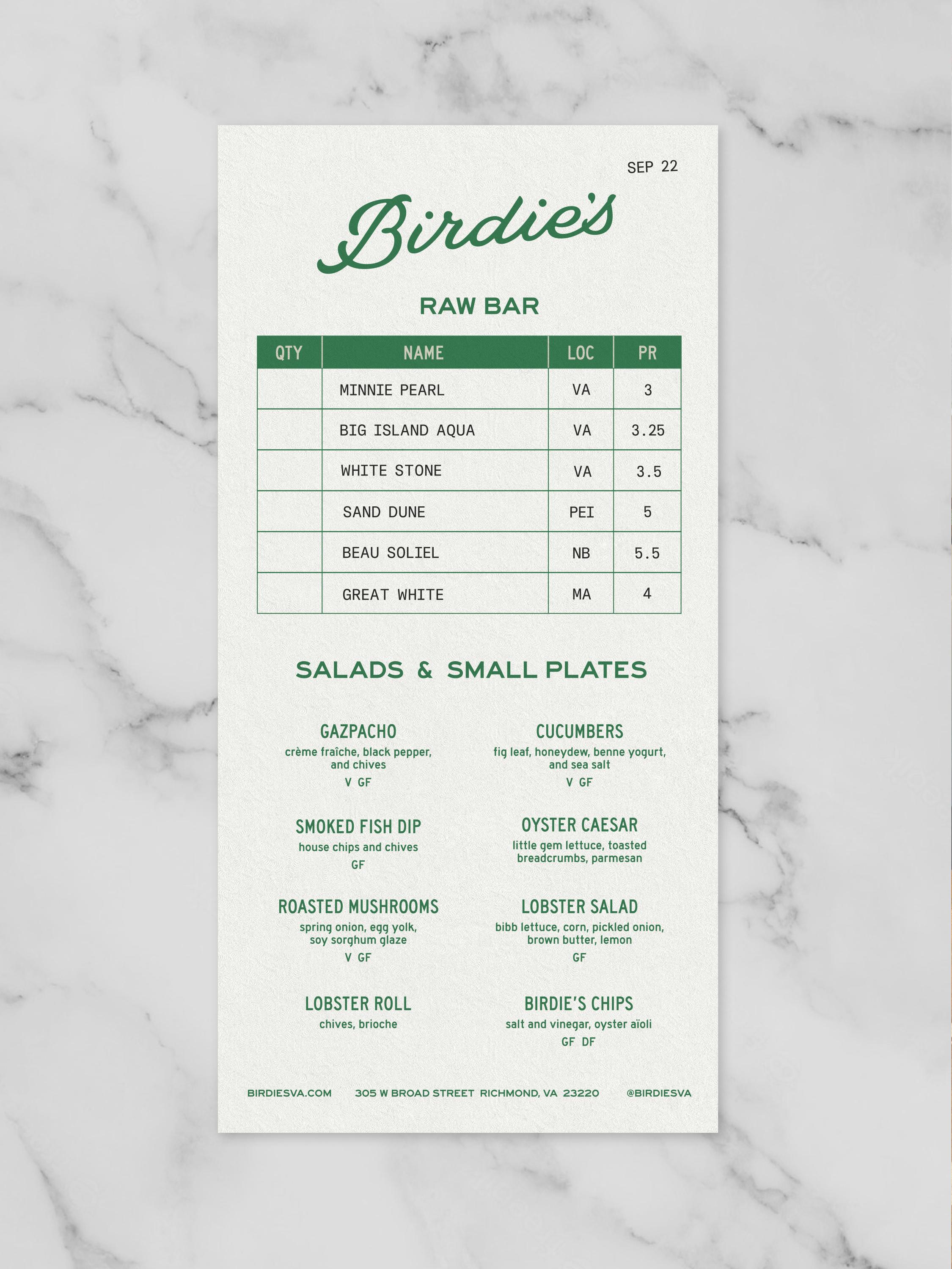 Birdie’s is a cafe, oyster bar, and wine cellar located in Richmond, Virginia. Beyond the roster of raw bar delicacies, many prepared dishes are featured on the menu devised by chef de cuisine Hunter Garvin.