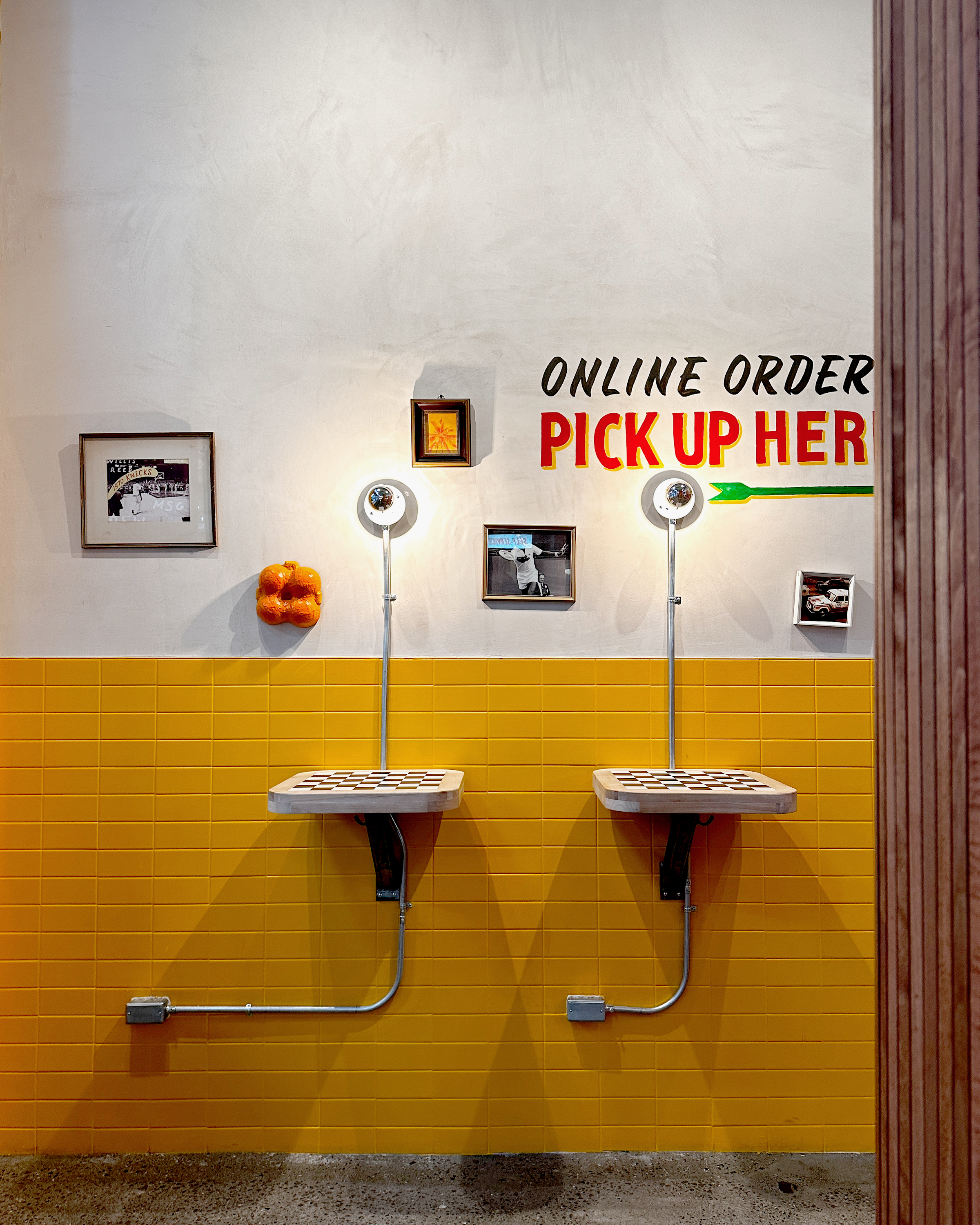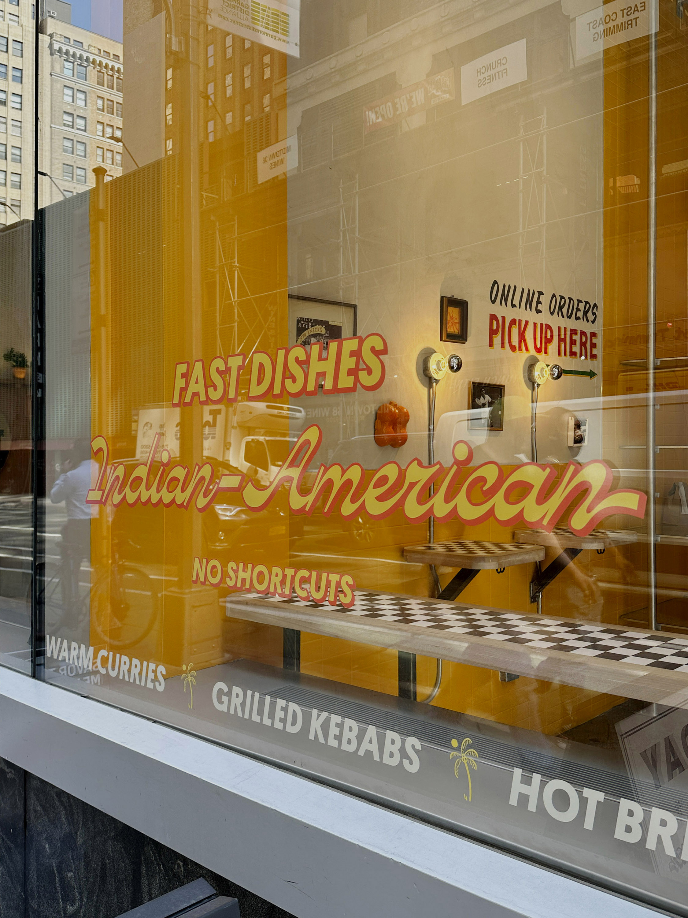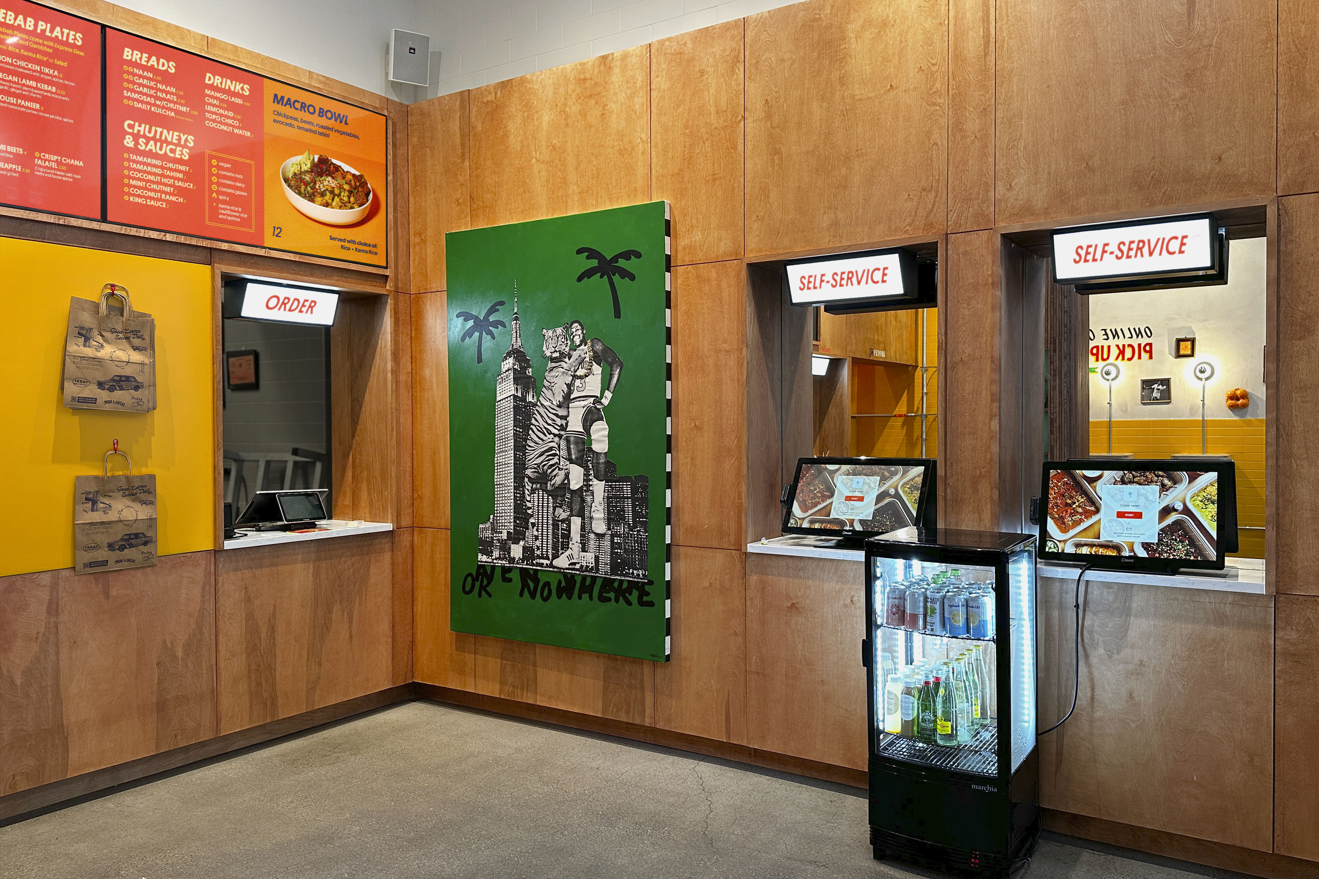 Interior activation also included television menu screen, signage and wayfinding.commissioned by Inday’s owner Basu Ratnam. Curated smaller artworks were inspired by New York and Indian nostalgia, including original artworks by Simi Mahtani (bulbs, found objects, paint and plaster on wood). Frames were thrifted from Mother of Junk in Williamsburg, Brooklyn and artwork was edited to fit frame dimensions. The intent of this wall design was to have more pieces added over time without feeling overly-curated.