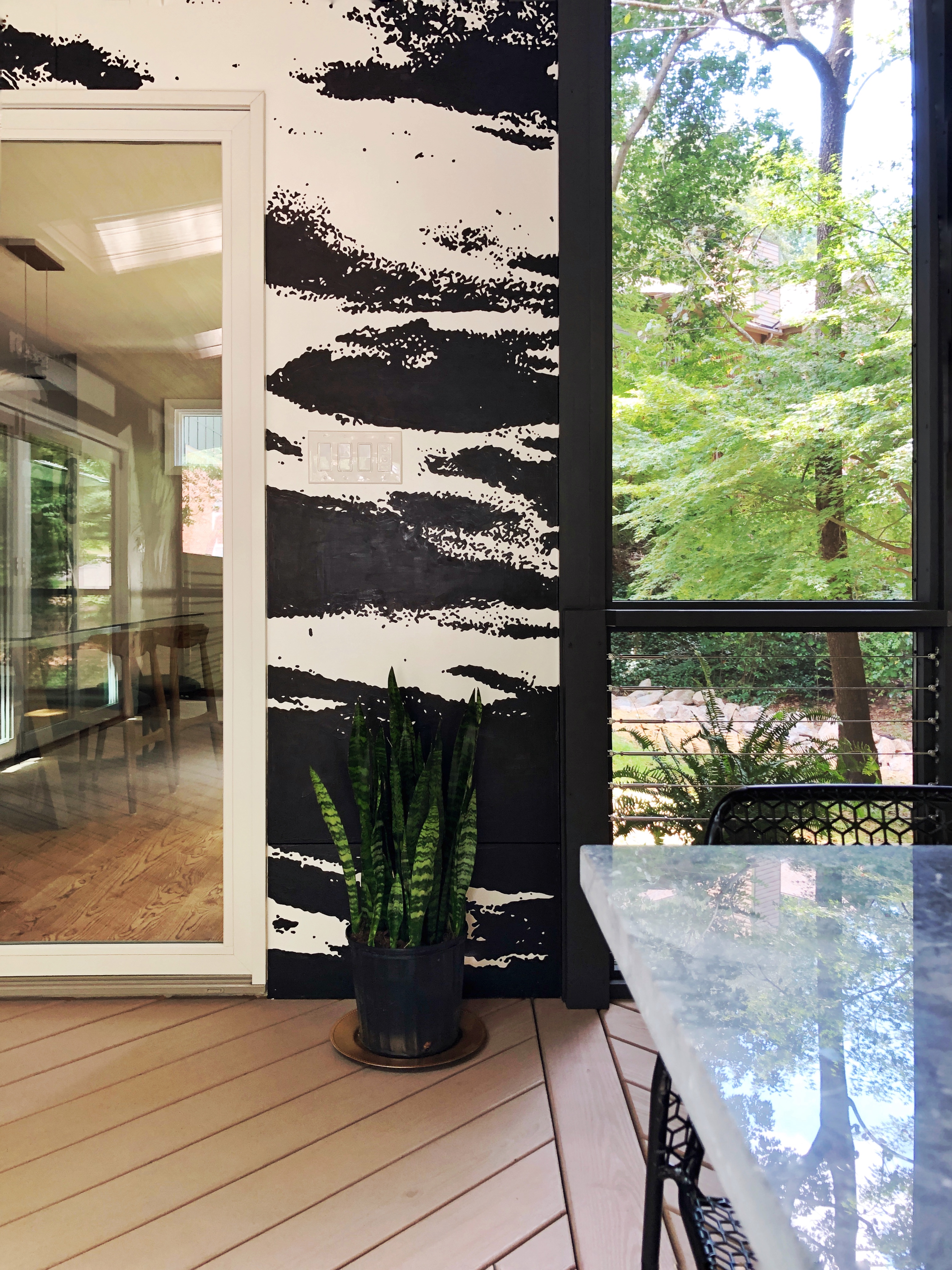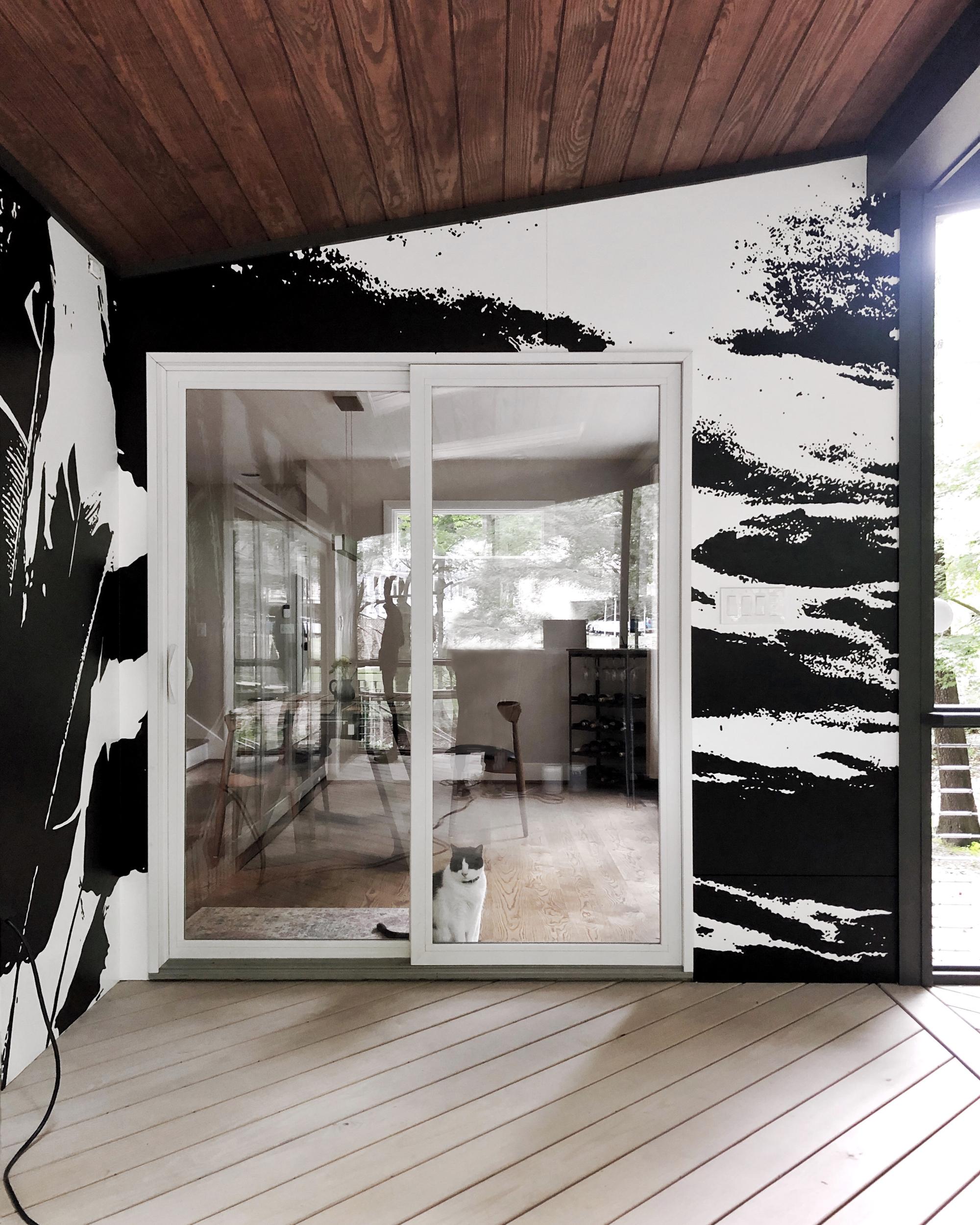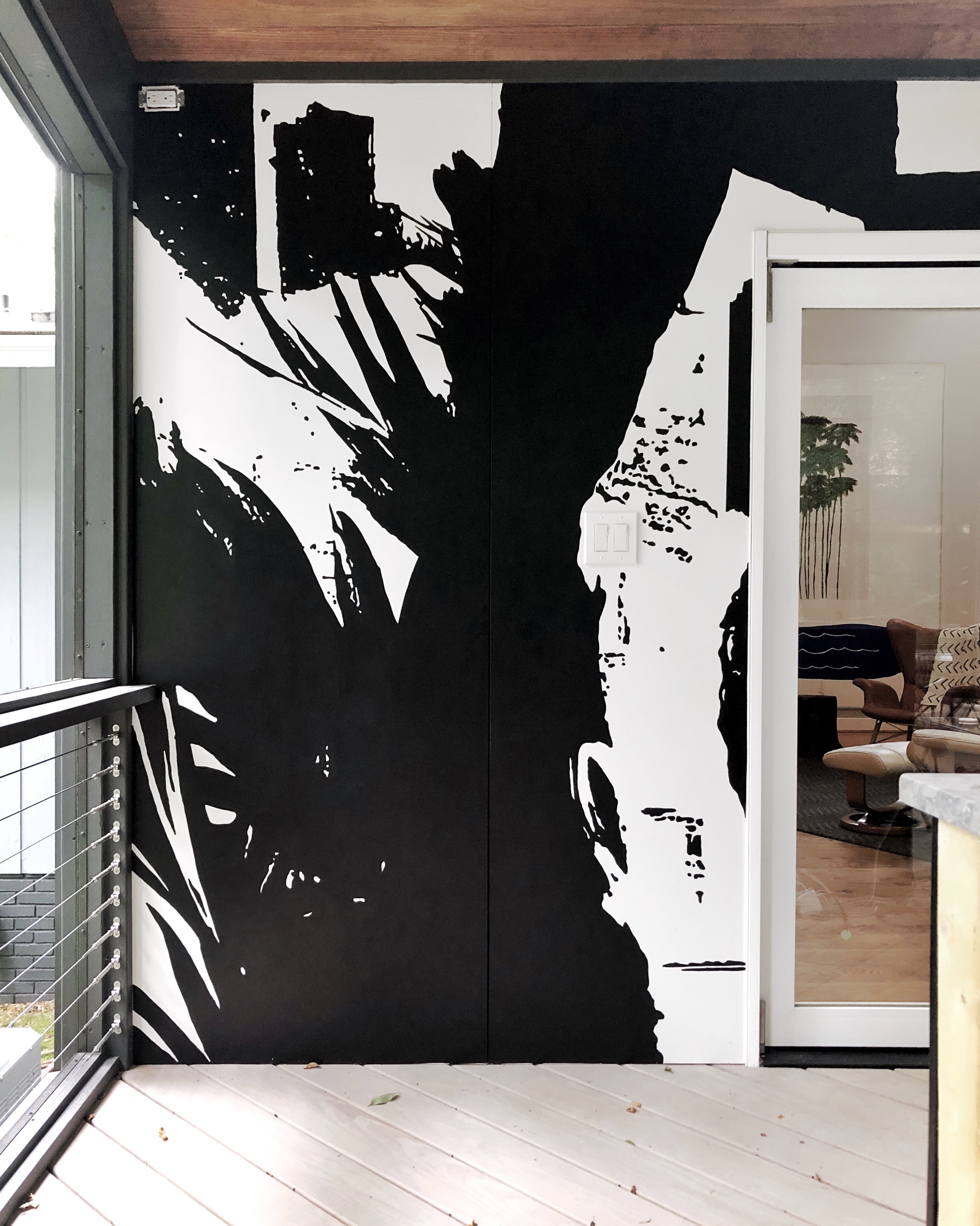 Look close! This mural was intentially designed to disguise outlets, light switches, and speakers.