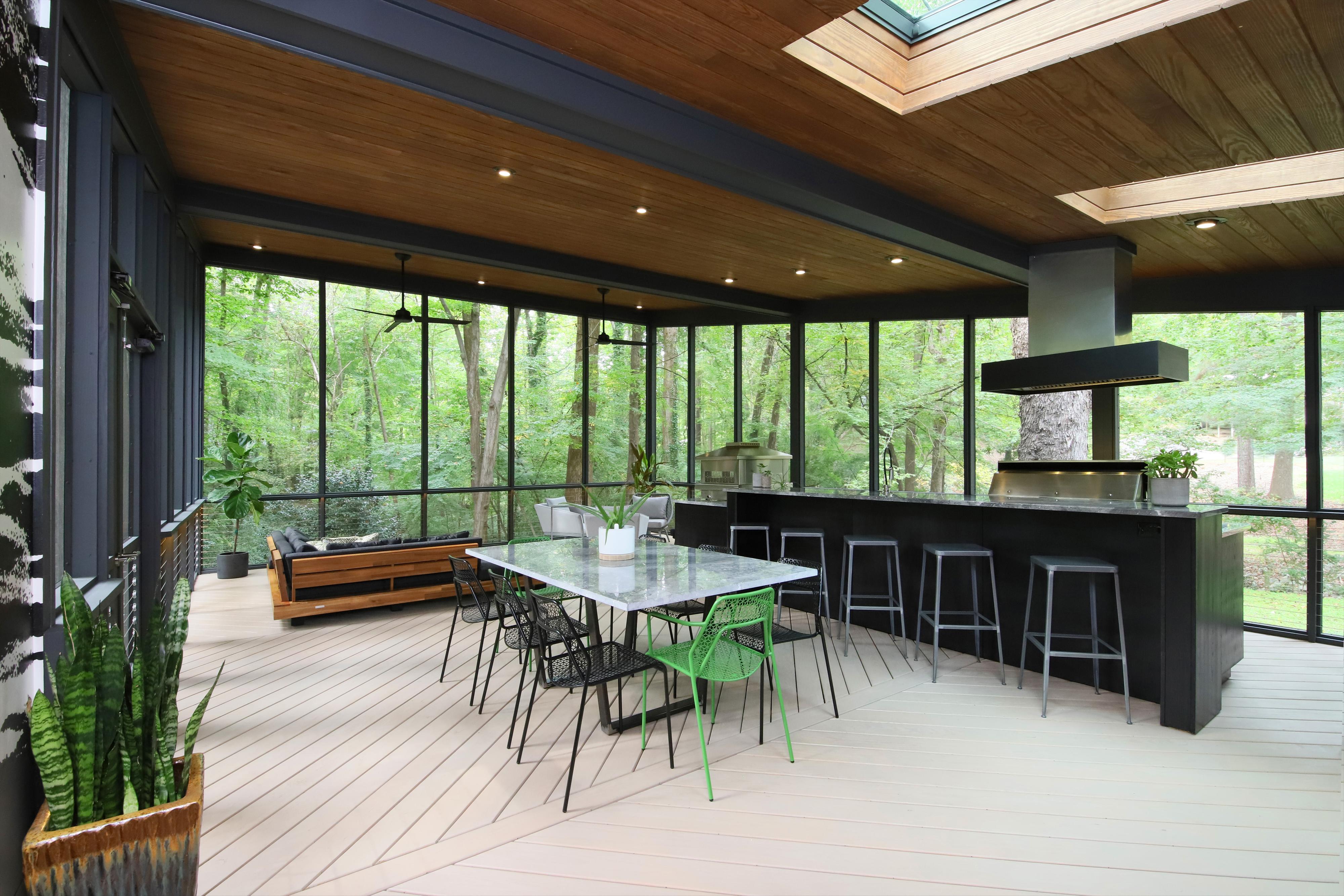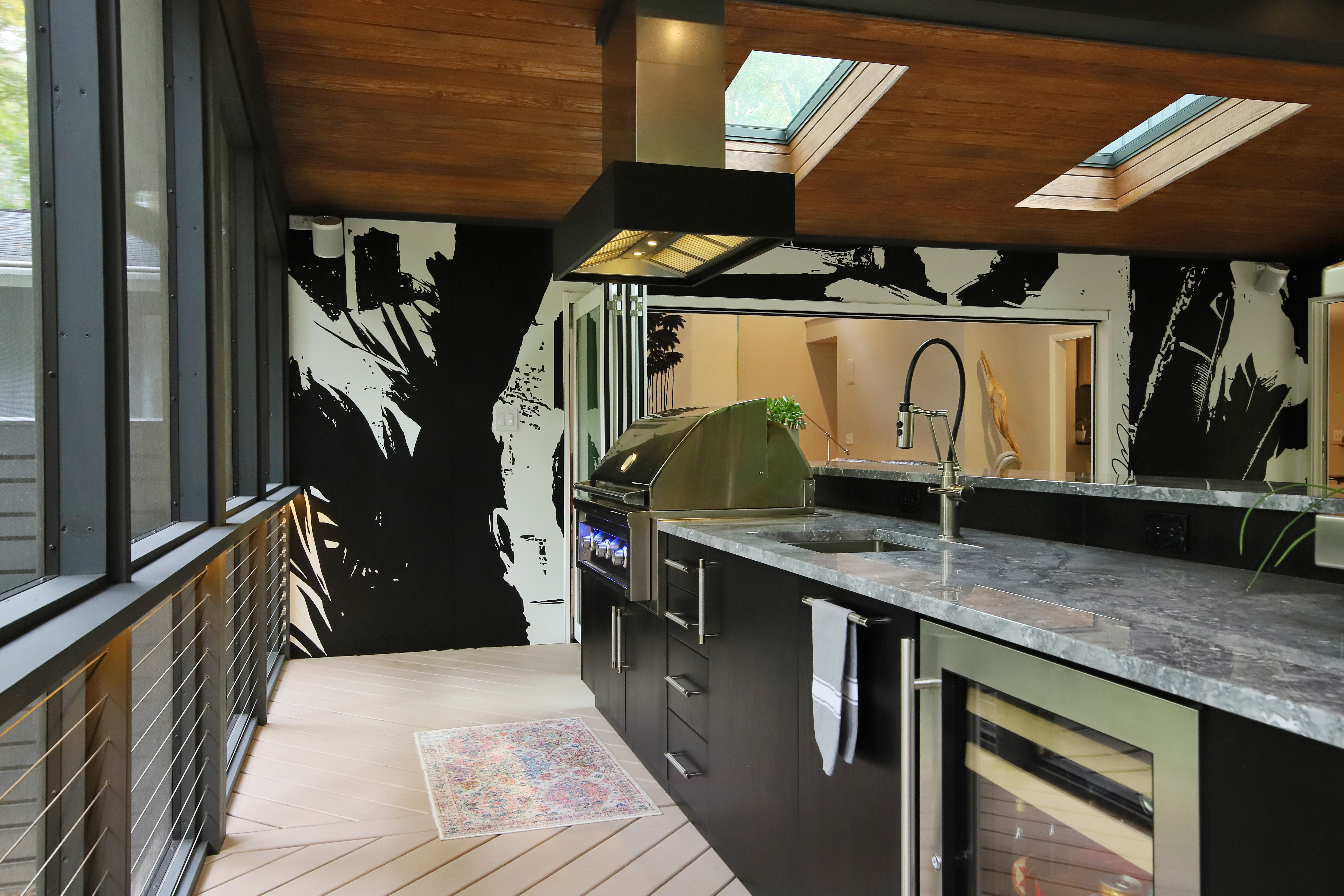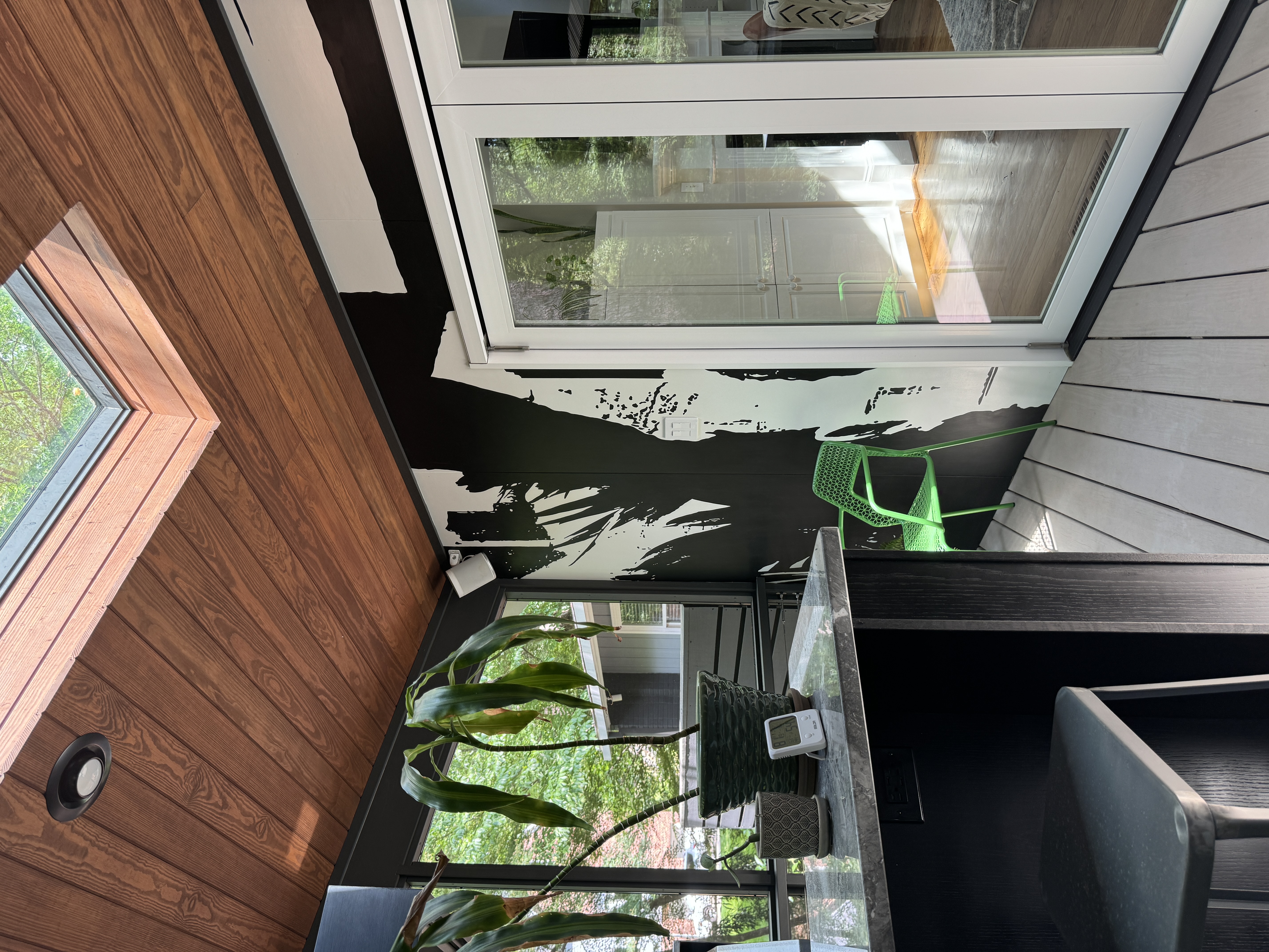 Look close! This mural was intentially designed to disguise outlets, light switches, and speakers.