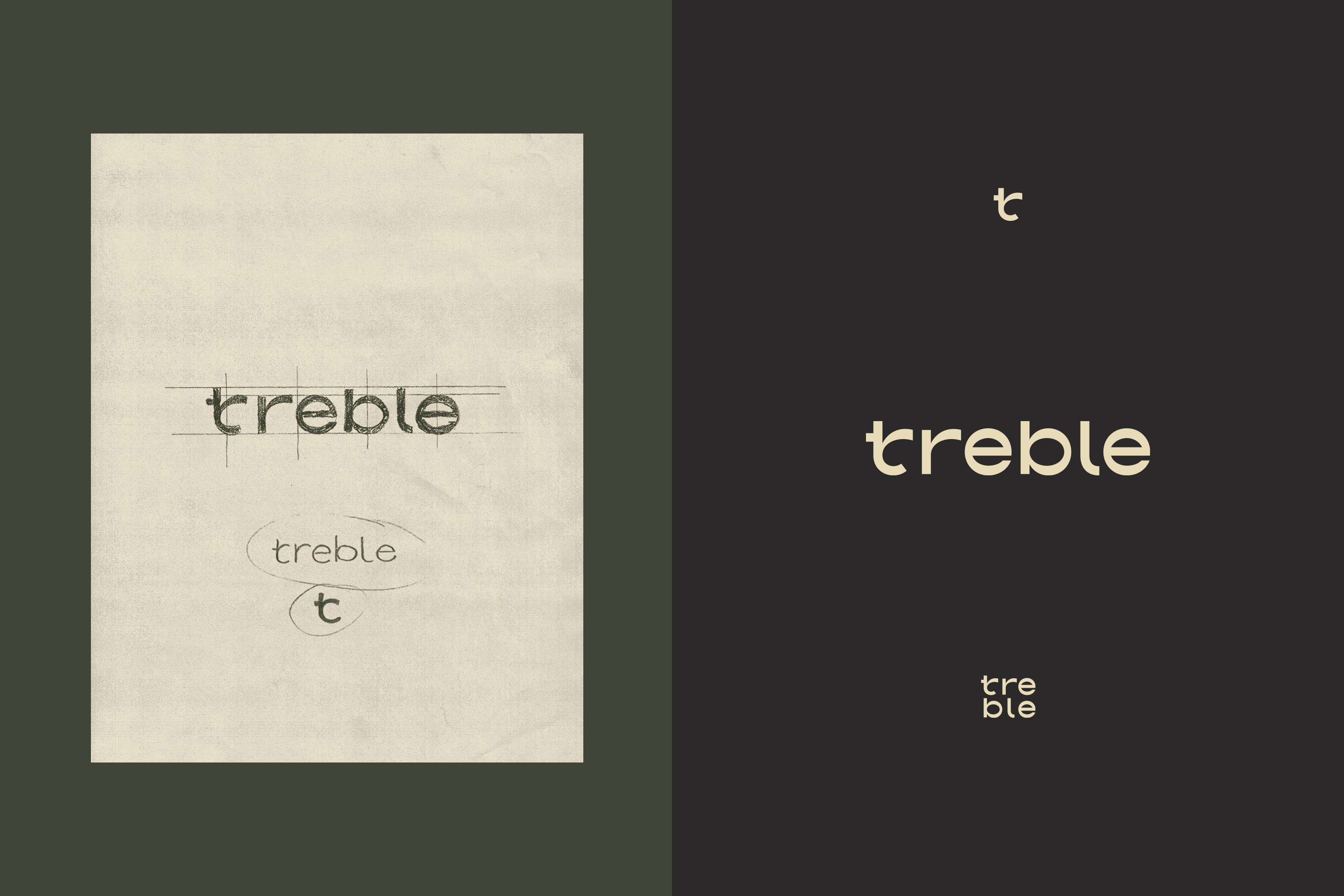 The Treble logo is a custom typography designed by Brendan Prince to evoke a natural, social, and comfortable feel. The letterforms are inspired by plants, growth, and visual representations of sound, incorporating intricate details.