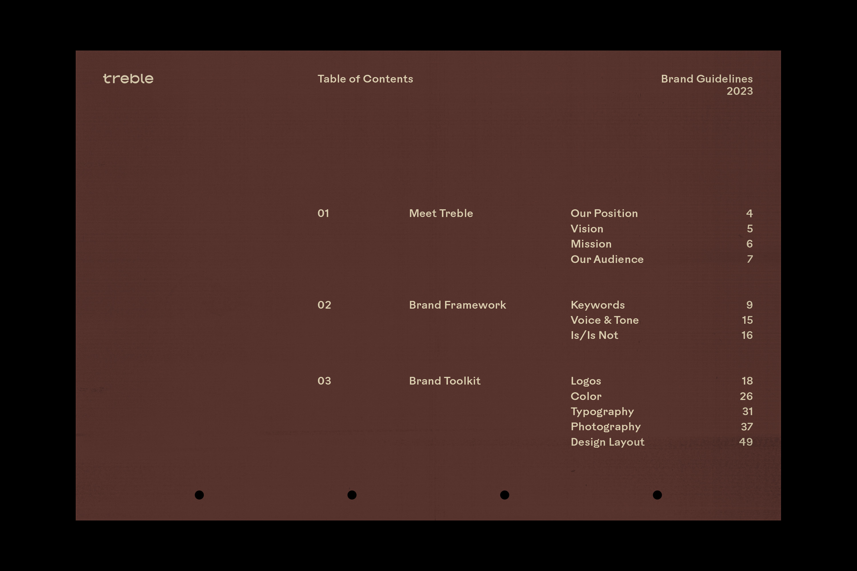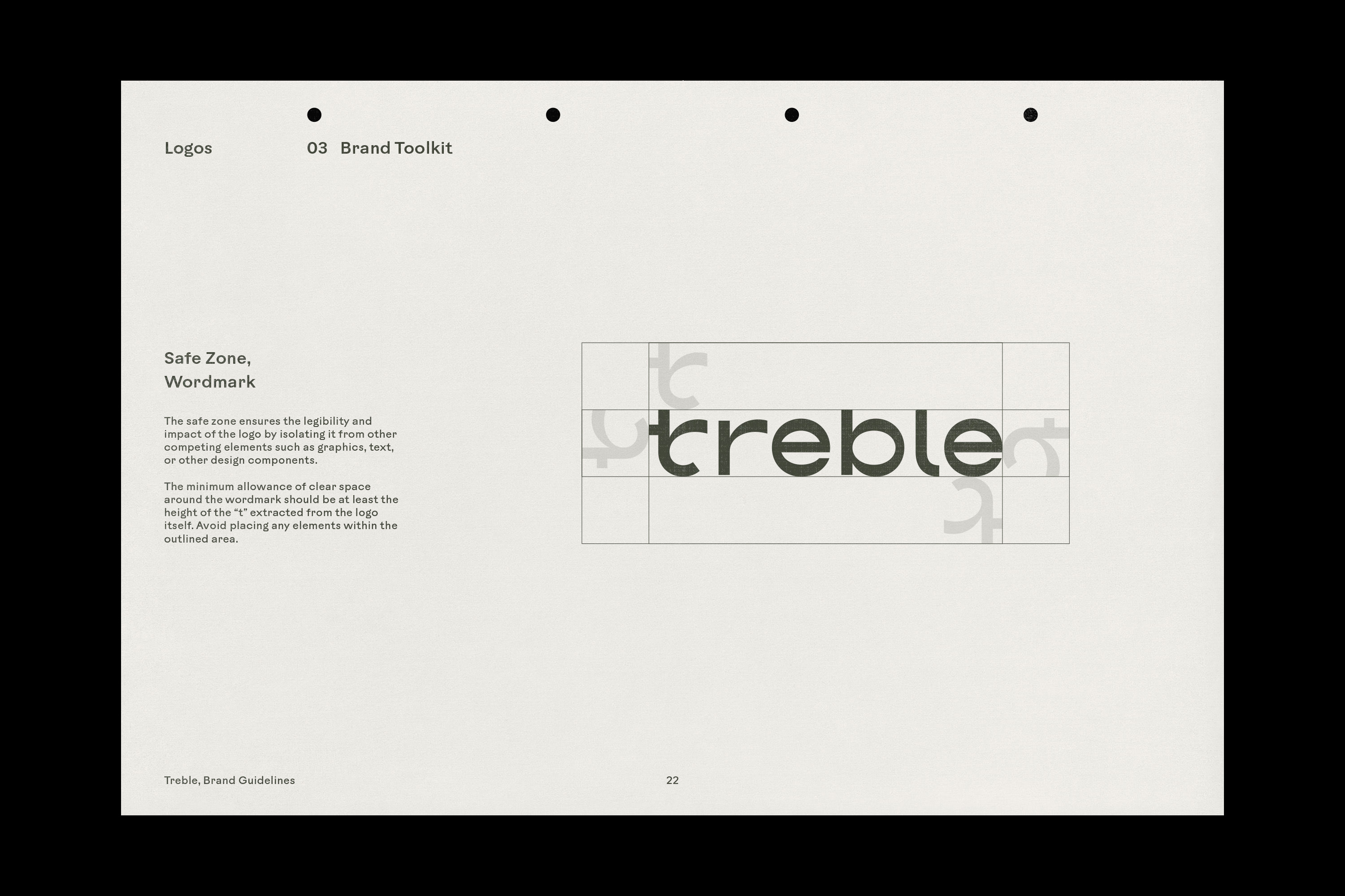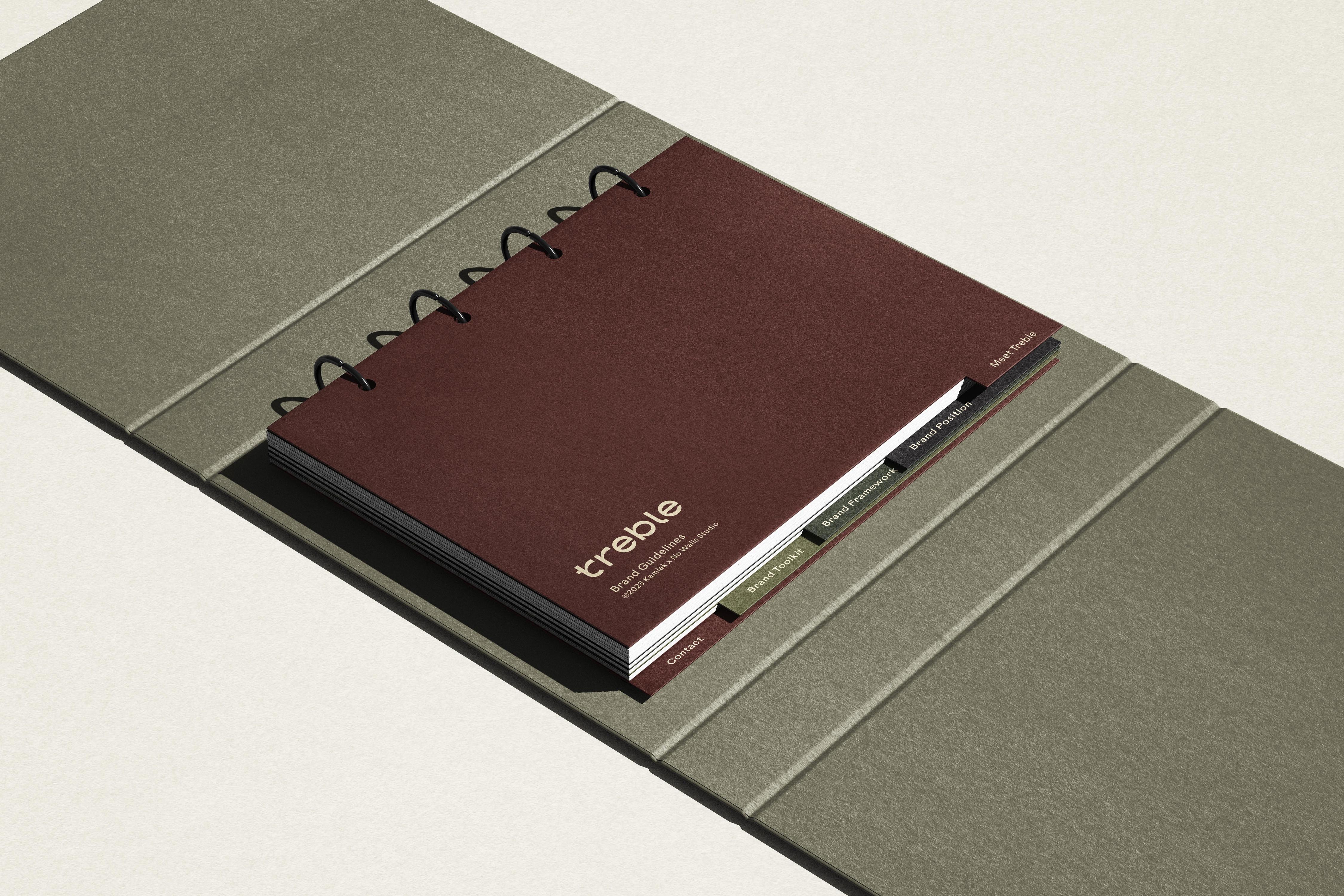 A brand toolkit was created to enforce consistency throughout the Treble brand, providing rules for each visual identity element, including logo, typography, color, design & layout, and photography editing.