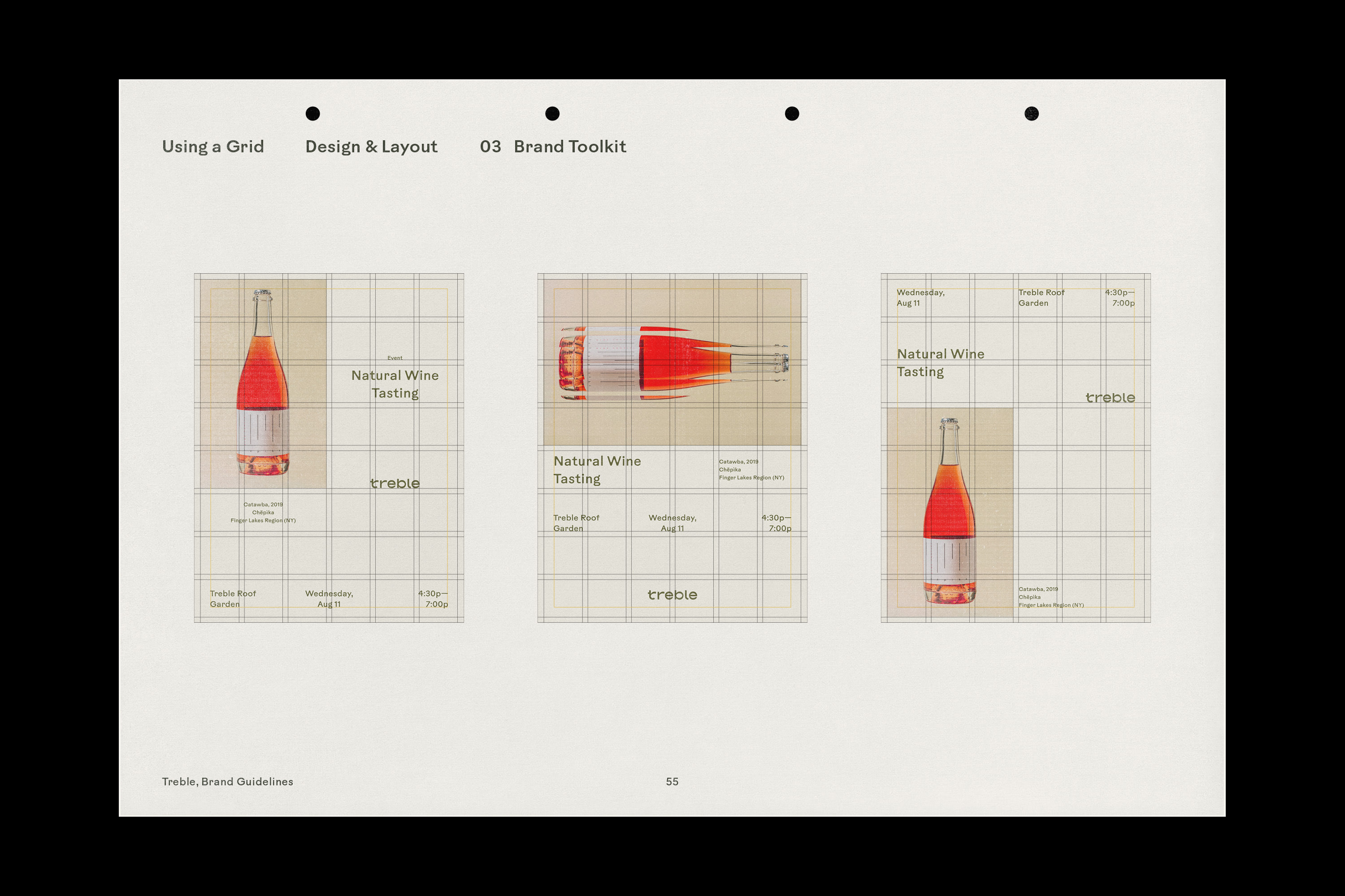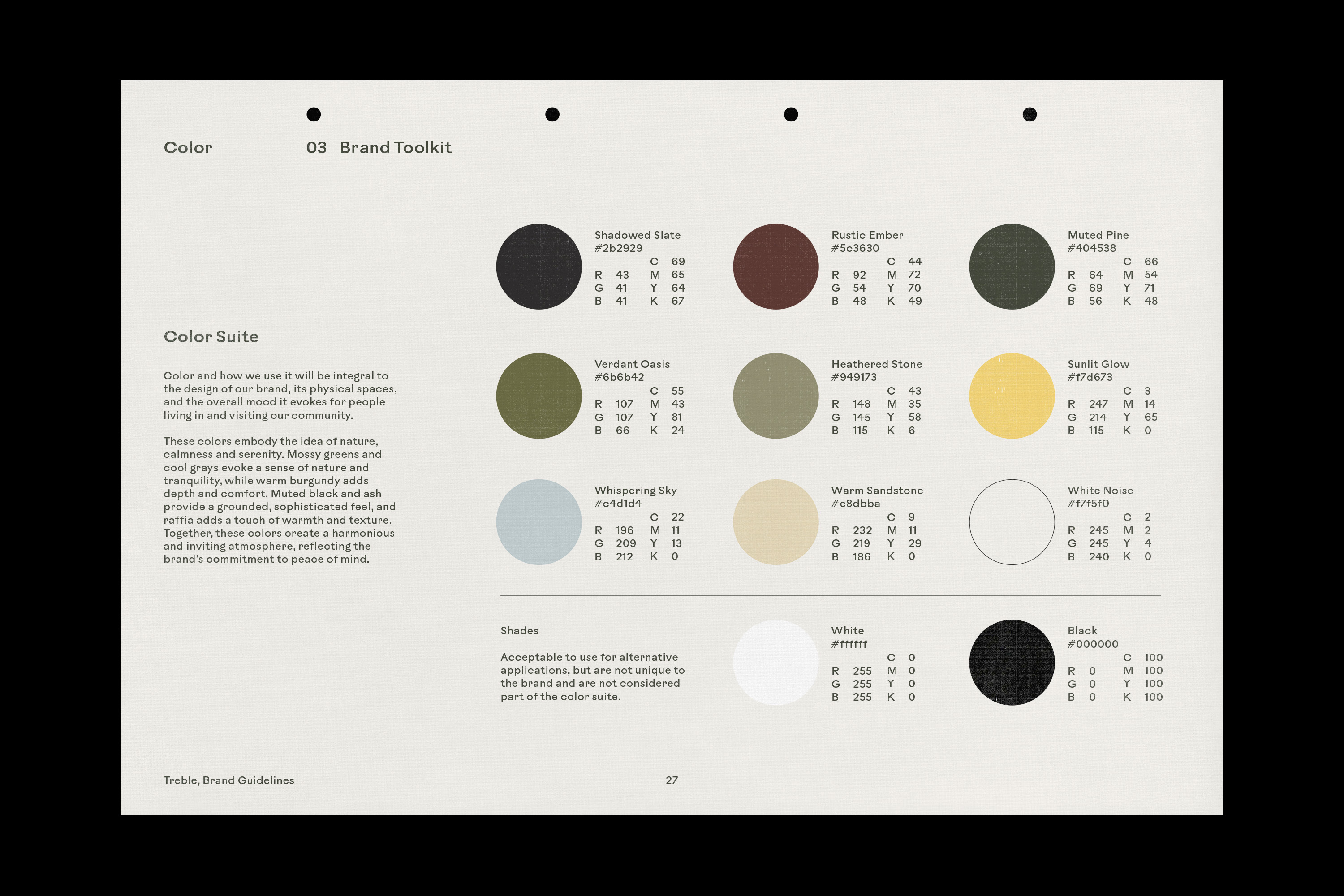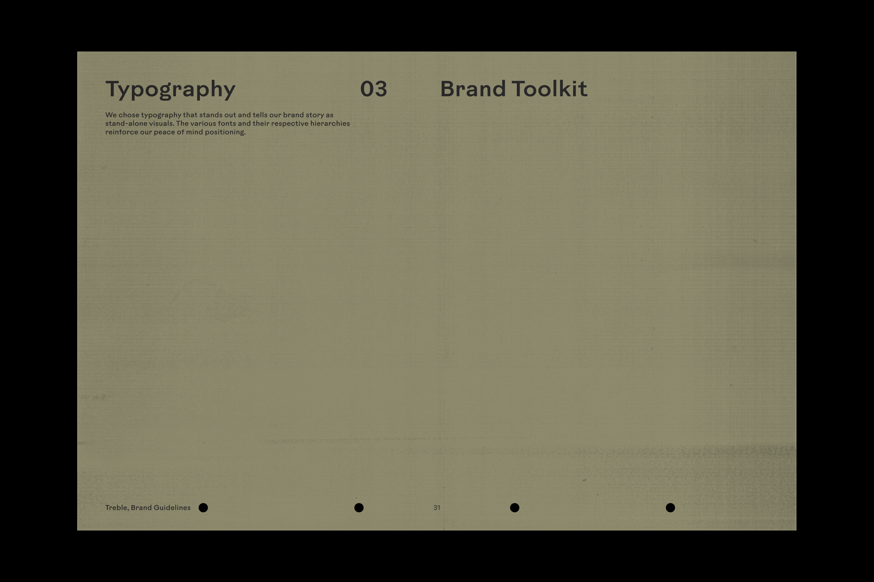 A brand toolkit was created to enforce consistency throughout the Treble brand, providing rules for each visual identity element, including logo, typography, color, design & layout, and photography editing.